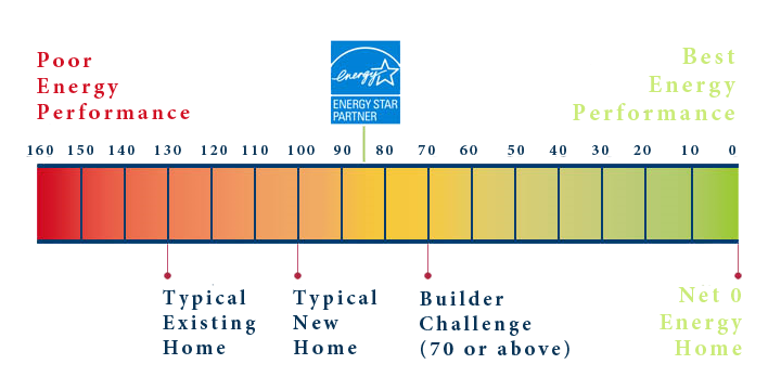 Typical new home represents the energy performance of a home built to code (2006 IECC) and scores a 100 on the E-Scale.